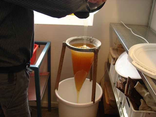 Derefter bliver honningen siet en gang til i en meget finmasket sigte, over en stor spand med tappehane.